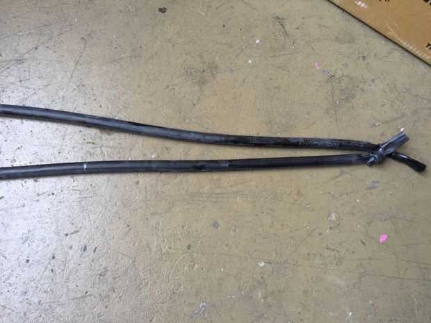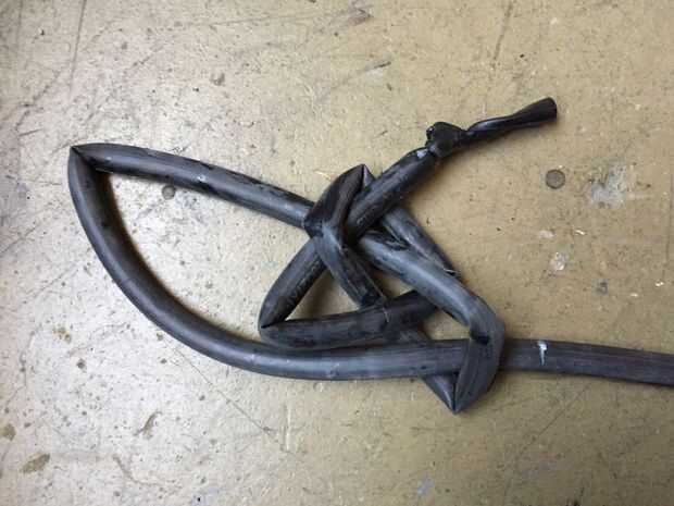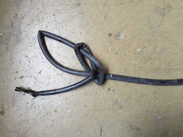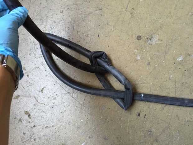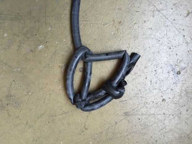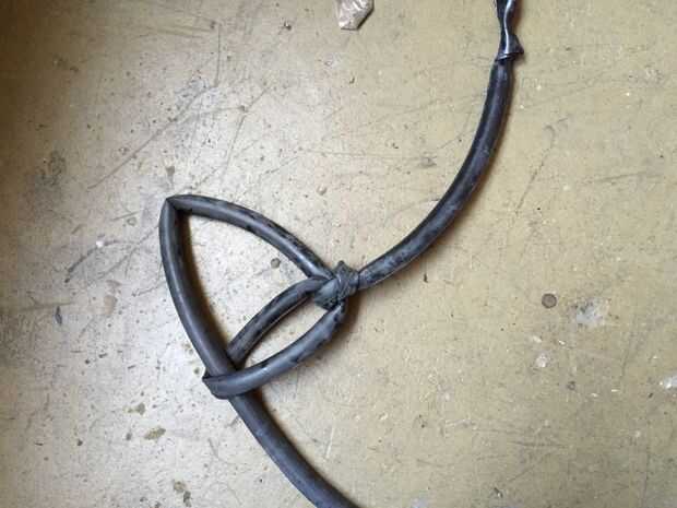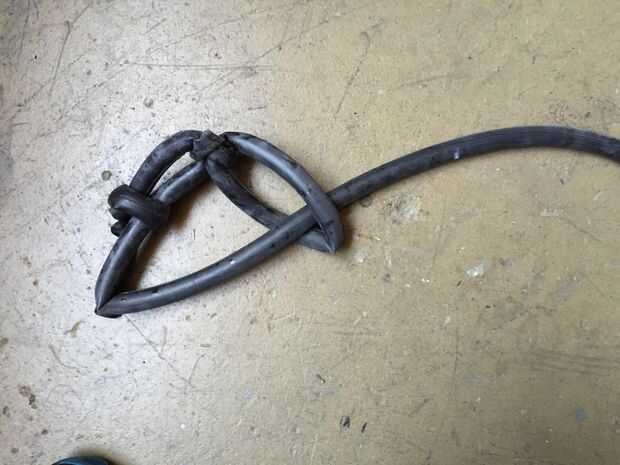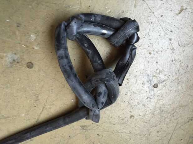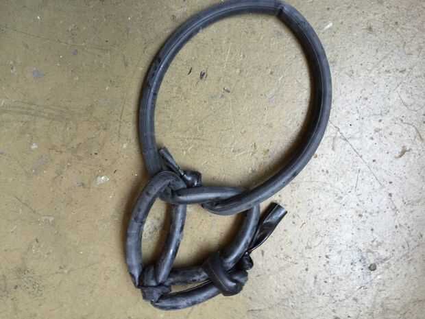 El neumático está ahora atado en ambos extremos y está lleno de epoxy que todavía está en estado líquido. Tenga en cuenta que se necesita aproximadamente 20 pulgadas de llanta ir alrededor de su cuello. Ató al azar en diferentes áreas, es un proceso espontáneo.