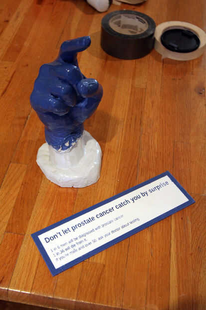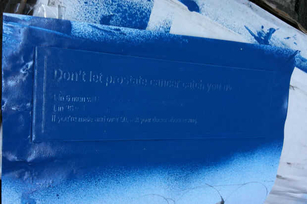 Luego rocía pintura azul en las superficies grabadas, dejar secar y quitar el masking para producir una placa azul y blanca.