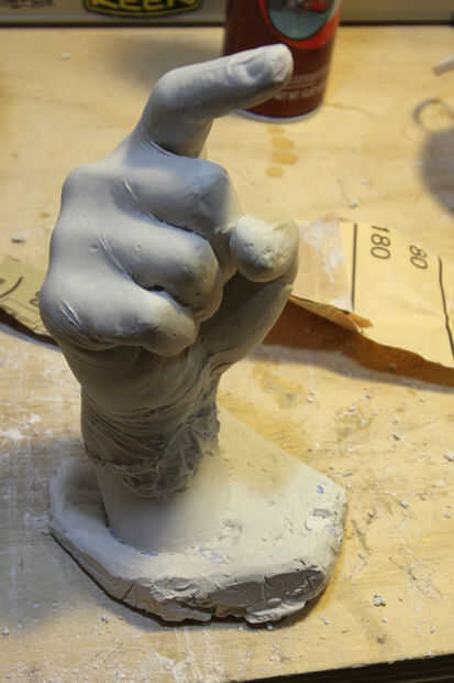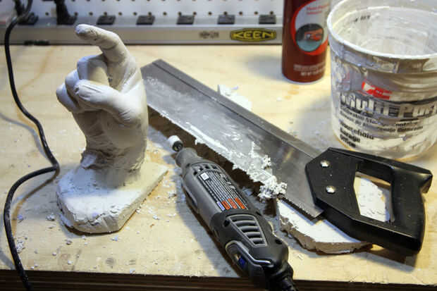 Las diversas imperfecciones en la copia de mi mano lo contrario perfecto se fijaron con un poco de lijado, nuevamente yeso y lijar nuevamente. Yo también recorta la base de la escultura con una sierra.