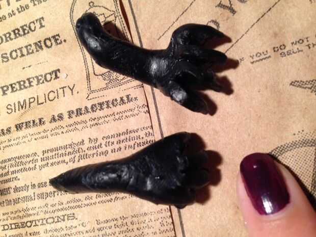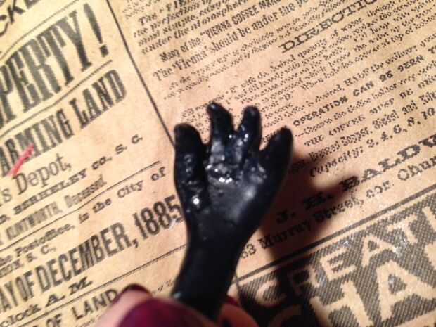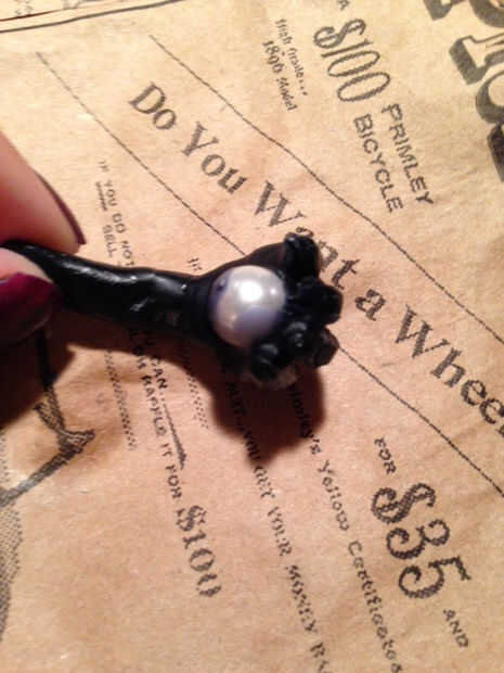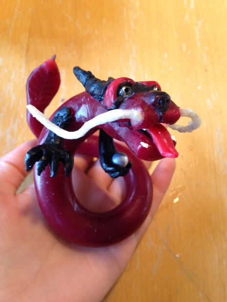 Para los brazos me utiliza una vela de 6" y cortarlo en dos trozos de unos 2cm de largo. Que sentarse en el baño de agua caliente durante un buen 5 minutos y darles forma como hicimos para la cola. Hacer 4 cortes en la mano para hacer los dedos y vuelva a colocarlo en el agua. Luego apriete los dedos se parecen más a las garras. Hice una mano estirada y la otra flexionada para mantener la perla. Mojar en agua fría y coloque una pelota en la mano agarre con un par de gotas de cera.
