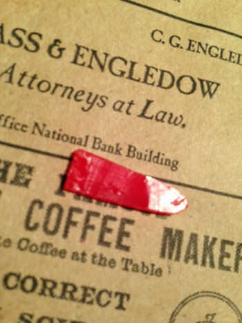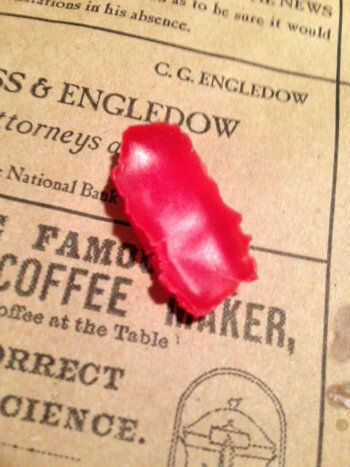 Para que la lengua tome un papel de aluminio y un pequeño bote rectangular. Encienda una vela roja y con los goteos en nuestro molde muy provisionales. Espere unos 5 minutos luego ejecutar bajo agua fría y salte hacia fuera. Tallar la forma de un duro y lo deje reposar en el agua caliente un poco. Una vez caliente la curva en una forma más natural. Enfriar otra vez y lo coloca en la boca del mismo modo que hicimos de los ojos. Ya parecen algo!