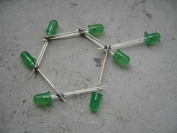 Tomar dos LEDs y poner para arriba como se muestra en la primera foto. Usted puede tener los LEDs formar cualquier ángulo, pero puesto que esto sería parte del anillo del benceno, son ángulo de 120 grados. Apretando las piernas juntas como esta fija les en lugar así que va a ser fácil soldarlos.