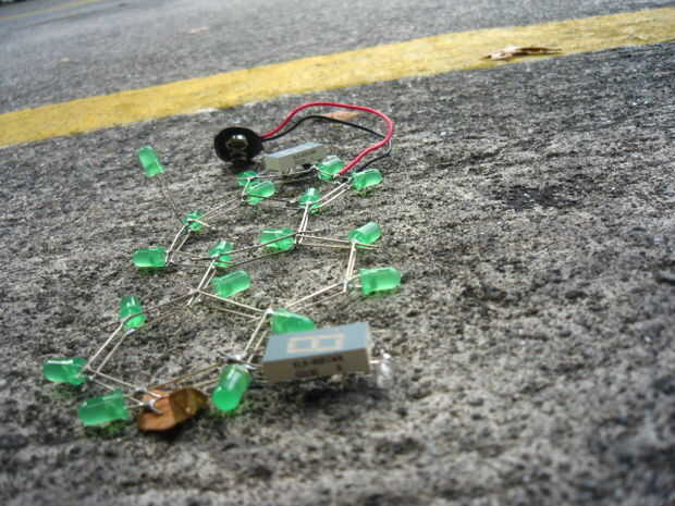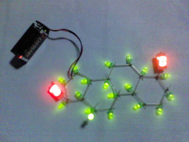 -Tomar nota de la polaridad: Suelde el cable rojo al lado positivo de la molécula. Cable negro va hacia el suelo. Nota: Usted debe poner la resistencia entre la molécula y el cable positivo rojo para evitar que se queme el LED. Realmente olvidé hacerlo, pero todavía va a ser muy seguro ya que tienes muchos LEDs en paralelo compartiendo la corriente.