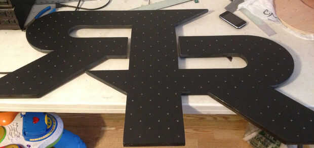 Ya que pegado vinilo a la cara de la insignia de madera tuve que cortar los agujeros para los LEDs.