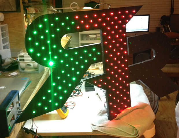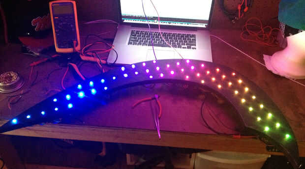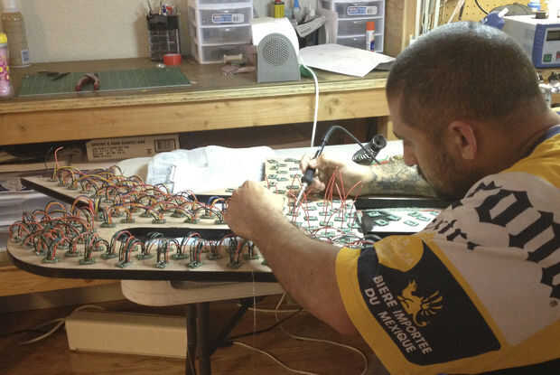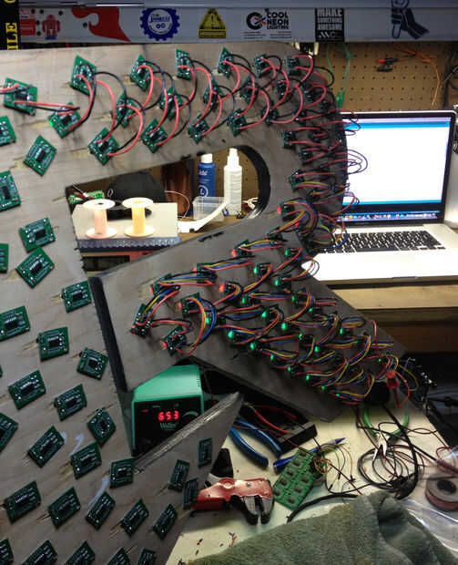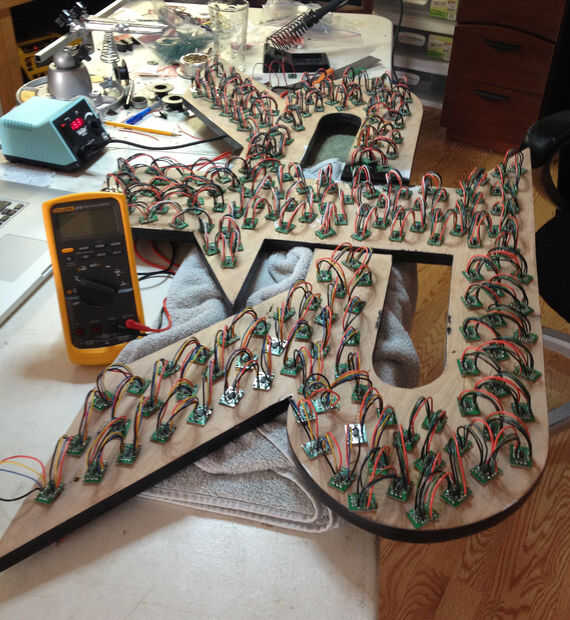 Corte y soldadura que cable resultó para ser muy desperdiciador de tiempo. Tuve que cortar 15 centenar de alambre a la longitud de 3 pulgadas, entonces tuve que tira de ambos extremos de todos los cables de cientos de 15. Tuve un montón de alambre alrededor de los proyectos anteriores para que me ahorró algo de dinero. Soldar el cable a 30 tableros a la vez y me había probado entonces la cadena de LEDs antes de ir más lejos. La prueba fue hecha por conectar un Arduino Deuemilanove y ejecutando el bosquejo strandtest de Adafruit. Aquí hay un video que hice para mostrar a mi amigo una vista previa del proyecto.