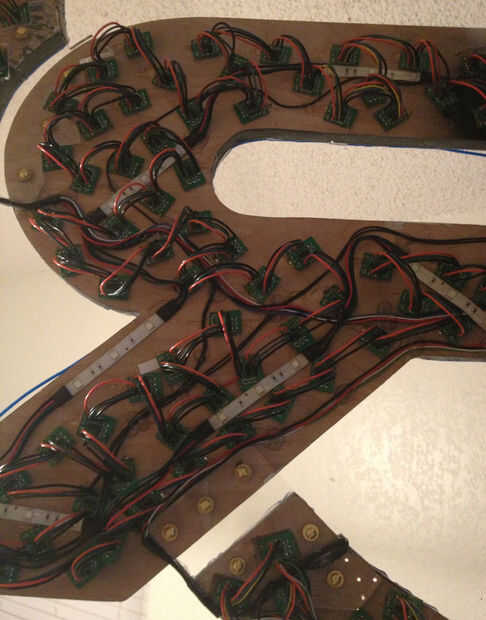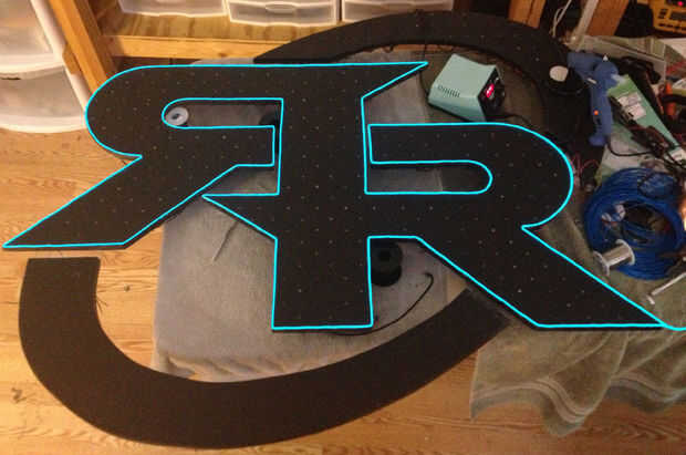 he utilizado pegamento caliente para fijar alrededor de 28 pies de cable EL azul hasta el borde del logo. También he añadido unos 10 pies de tira del RGB LED de la parte posterior de la R & R sección (esto le da un efecto de resplandor posterior).