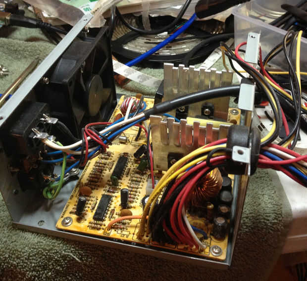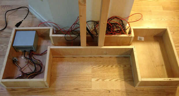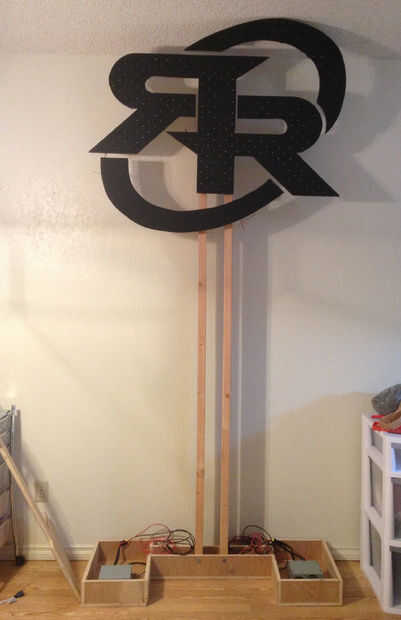 El soporte está hecho de dos montantes (8 x 2 x 4). Los montantes se atornillan en una caja de madera contrachapada. He hecho el cuadro en esta forma para que la batería puede sentarse justo bajo el logo. La caja también contiene un par de fuentes de alimentación de ordenador (he comprado una caja de 12 fuentes de alimentación de una venta de garaje para 2$). Una de las fuentes de alimentación para poder utilizar el inversor y la tira de LED RBG. Las fichas de poderes la WS2801 otras fuente de energía y de los micro controladores. La caja tendrá una tapa para cubrir la alimentación y el cable, luego será cinta de LED tira a la parte superior de la cubierta. El logo se monta en el soporte con soportes de marco de aluminio que encontre en Lowes