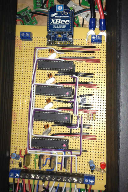 El receptor contiene cuatro chips de Atmega328 con Arduino bootloader también cuatro Mosfets de canal N para ayudar a controlar los LEDs RGB y el inversor. Los cuatro 328s puede transferir información utilizando el bus i2c.