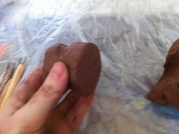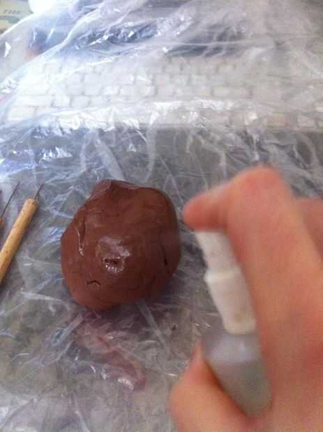 Agarrar y formar una bola de 5" de arcilla y rociarlo con agua si su duro y amasarlo hasta que esté bien mezclado, considero la consistencia adecuada para esculpir es suave, pero un poco más dura que la masa de galletas. No moja la arcilla o de lo contrario resultará demasiado pegajosa para trabajar con. Rocíe la arcilla cada de vez en cuando cuando siento su desecación [sólo rocíe la arcilla cuando se siente seca a usted].