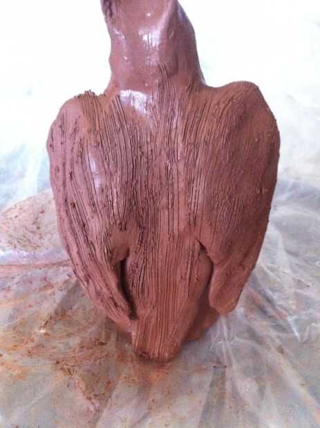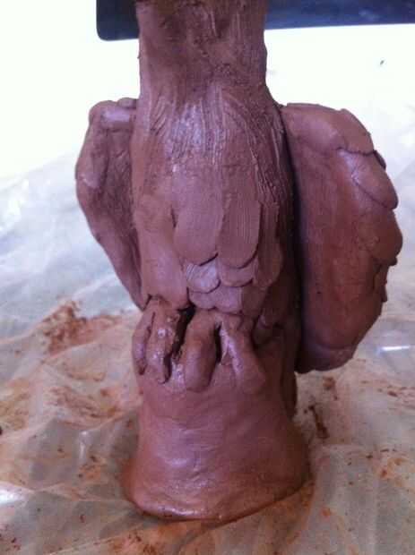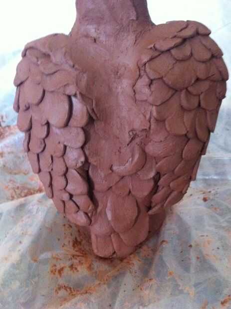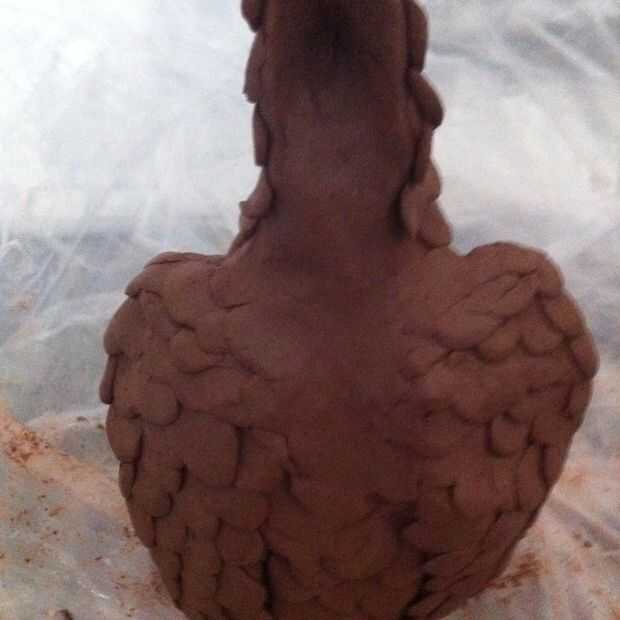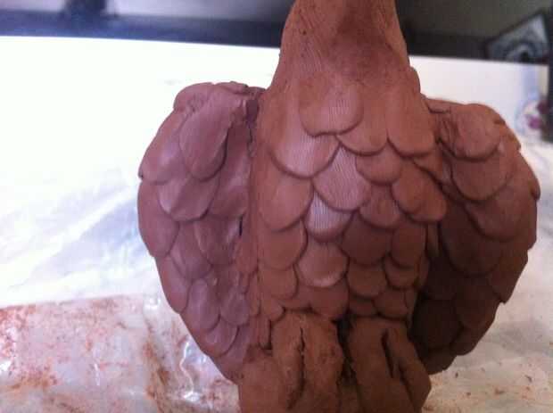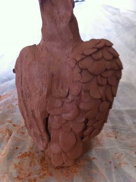 Empezar con plumas de la cola larga, trabajar a través de la espalda, luego trabajo de las puntas de las dos alas con las plumas de vuelo largas y satisfacer las plumas en la parte posterior. Luego trabajo alas de la parte delantera de las dos puntas del interior y hacia arriba y hacia adentro hacia el cuello asegurándose de cubrir el lado de las alas y se solapan y cubren espaldas plumas de las alas totalmente y limpio.