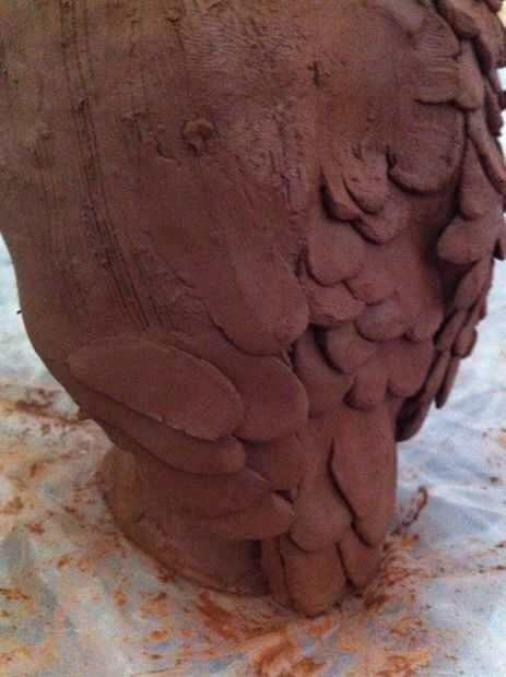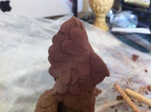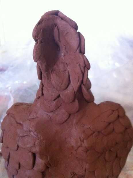Para hacer plumas, desde los extremos y las plumas de la capa hacia arriba y hacia adentro. Se trabajará de cola a cabeza para que las plumas se superponen y acabado limpio en la nuca hacia atrás y en la corona.