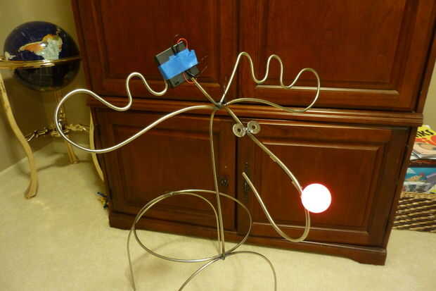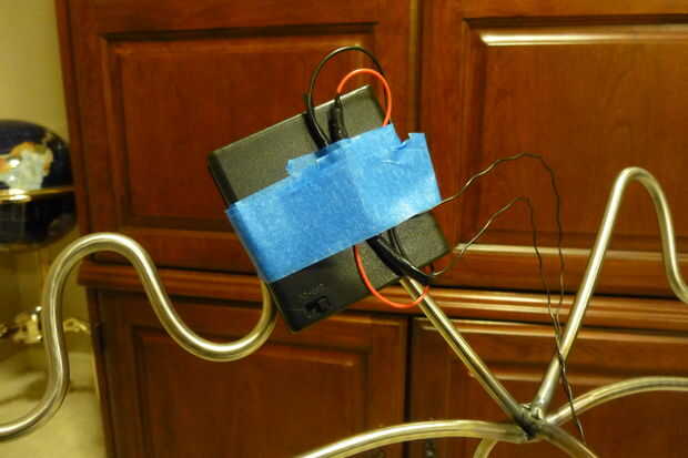 Con la caja de la batería en su lugar puede poner el interruptor en la posición "ON" y ver cómo se verá la nariz de los alces. Encontrar el lugar que te gusta mejor y fijarlo con un trozo de cinta adhesiva de 3M comando. Sólo corté un trozo cuadrado de un pedazo sobrante que teníamos. Usted tendrá que colocar el punto donde el LED pasa a la pelotita de ping pong a un lado de la barra de acero. La coloqué en la parte menos sensible de los alces.