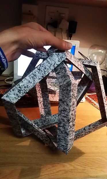 Hola!Se trata de una escultura de 6 prismas rectangulares, formando un cubo.El plegado es muy sencillo, así como el tejido, los bits sólo duros están sujetando el pasado algunos pedazos de papel al final.Este modelo se hace evidentemente sin pegament