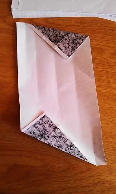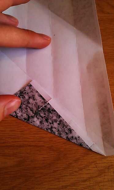 Valle de doblar la esquina inferior izquierda hasta que apenas toque el pliegue pauta sólo hizo y asegúrese de que la esquina del pliegue en exactamente en el pliegue anterior de pauta hace.