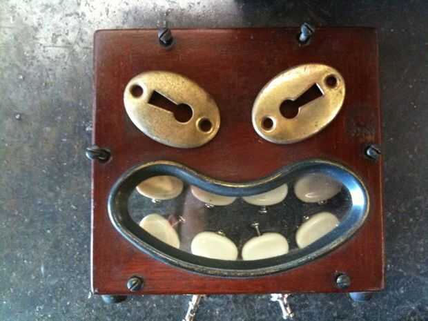 A partir de un proyecto es la parte más difícil. Para mí, generalmente comienza cuando reconozco una cara o alguna otra característica de la vida como en un objeto. En este caso era un medidor de voltaje de madera vieja. Voltea hacia abajo, la ventana forma una muy buena boca. Bocallave bronce cubre hechos buenos ojos y perillas de ukelele hechas de dientes perfectos.
