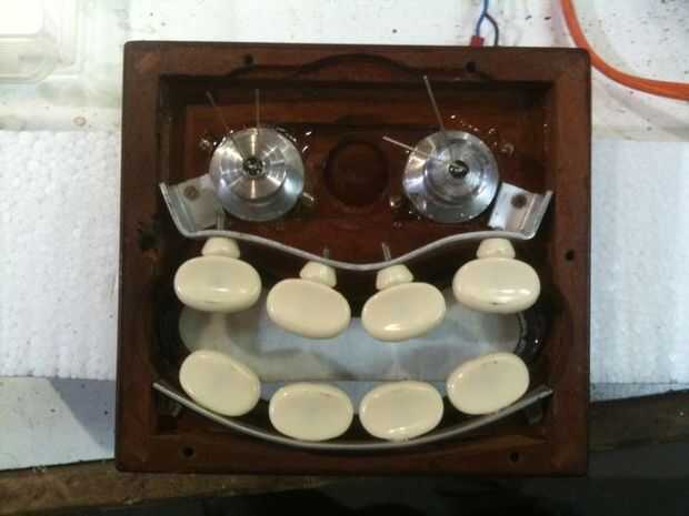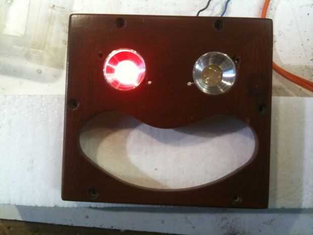 Habiendo decidido me gustó la idea de la cara bastante, era el momento de cavar.  Yo quería que haya luz que viene a través de los orificios para que LEDs se montaron detrás de ellos.  Puesto que había que un montón de espacio interior decidió añadir un motor y una máquina que haría la cabeza de la inclinación de lado a lado.