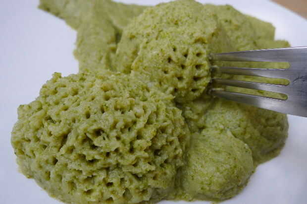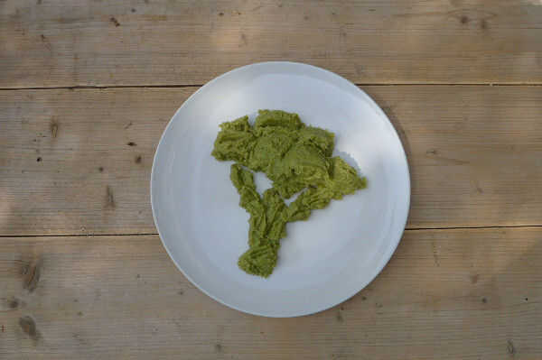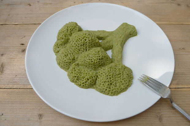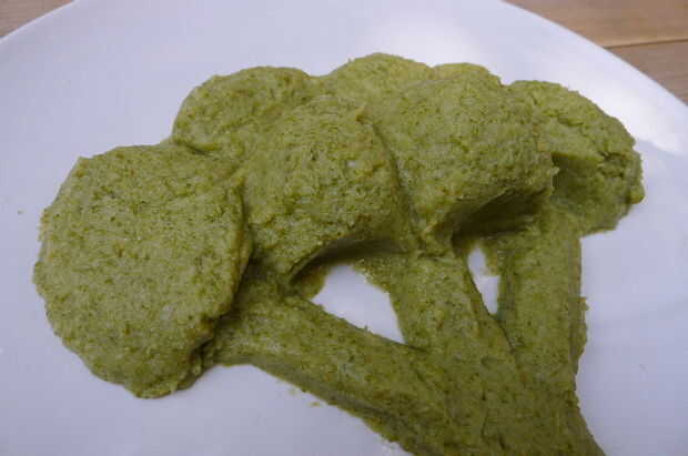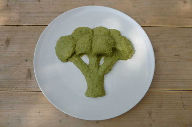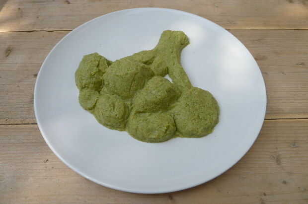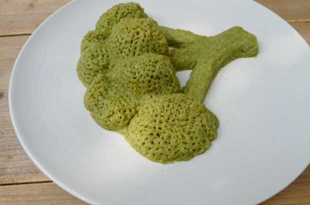 El día 1 así te sirven un muy grueso brócoli sopa (o llame al puré de brócoli). Día 2 usted puede formar entonces la pulpa sobrante de brócoli sobre un plato en forma de un brócoli (o cualquier otro objeto) mediante el uso de simples utensilios (cuchillo, cuchara, tenedor). Si no lo haces todavía el día 1 utiliza una batidora para obtener el derecho propiedades de modelado.