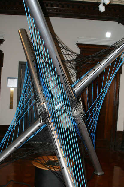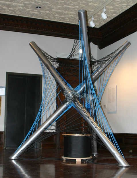 - Fibras conductoras son trenzadas con fibras tradicionales para producir una cuerda patentada que es capaz de soportar una carga y el peso de la carga de monitoreo. La cuerda actúa como su propio calibrador de tensión, control de tensión constante mientras la cuerda se usa. En esta instalación, cambiando la tensión en el azul detección cuerdas crea una señal eléctrica que modula la música que se escuchará a través de un sintetizador. Así como el sistema muscular esquelético humano es un tensegrity del músculo y el hueso, las cuerdas y tubos de aluminio forman un tensegrity de tensión y compresión, empujando y tirando, ingravidez y gravedad.