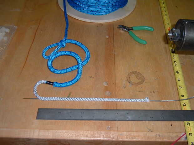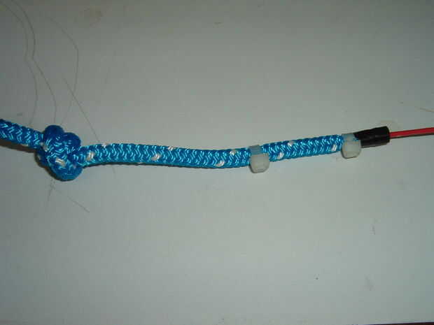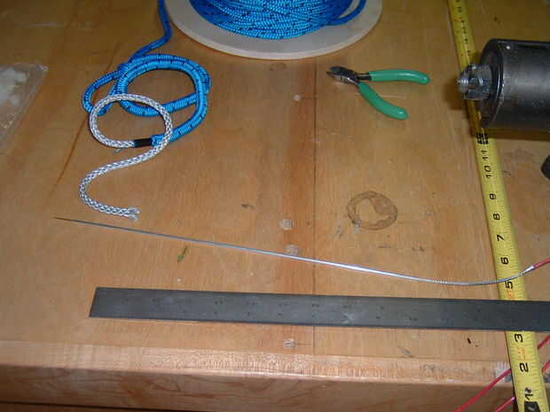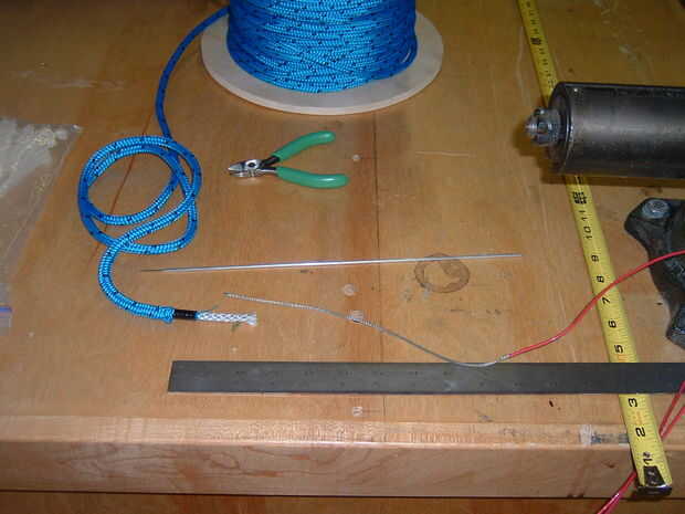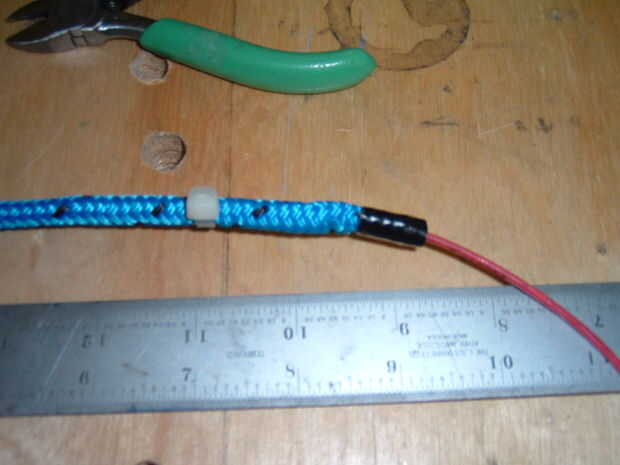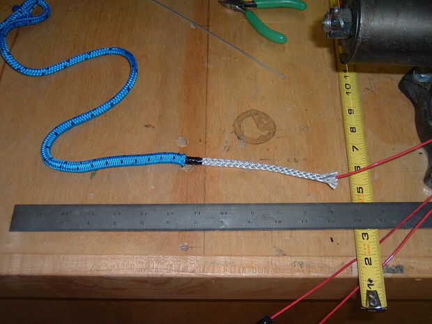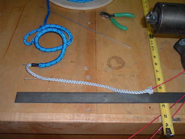 Las cuerdas detección de soft-circuito necesitan para conectarse a regular alambre en cada extremo.  Creamos una conexión flexible y alta área de superficie mediante un segmento de trenza de cobre.  Ver la secuencia de fotos con información sobre la foto para ver cómo se hace.