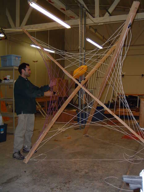 La pieza se llama 'Quiralidad', significa 'uso de las manos' y es una escultura de tensegridad de gran escala que fue diseñada y construida para el año 2015 de hombre ardiente en el lapso de cuatro meses. Fue construido en el sitio por un equipo dedi
