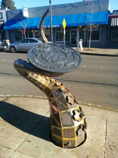 La pieza se llama "El visitante", un tentáculo de acero oxidado empujando a salir de una boca. Se puede encontrar en el 23 y el principal en Vancouver, WA.