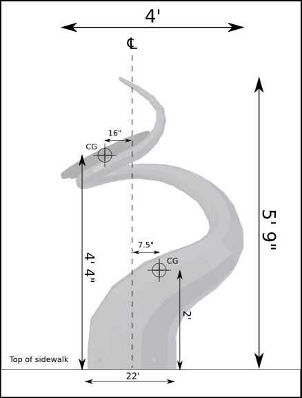 Después de la reunión había finalizado el diseño. Esto cubre cuestiones puramente estéticas, como sin parar ajustar la curva del tentáculo a mi satisfacción final. También incluye preocupaciones prácticas planteadas en la reunión, como asegurándose de que la cubierta de boca estarían dispuesta demasiado escarpado para que sea un lugar de descanso tentador para la basura. Luego elaboró planes precisos de la estructura de montaje y había previsto a los ingenieros de la ciudad con más detalles como dimensiones y centros de gravedad diferentes partes de la estructura.