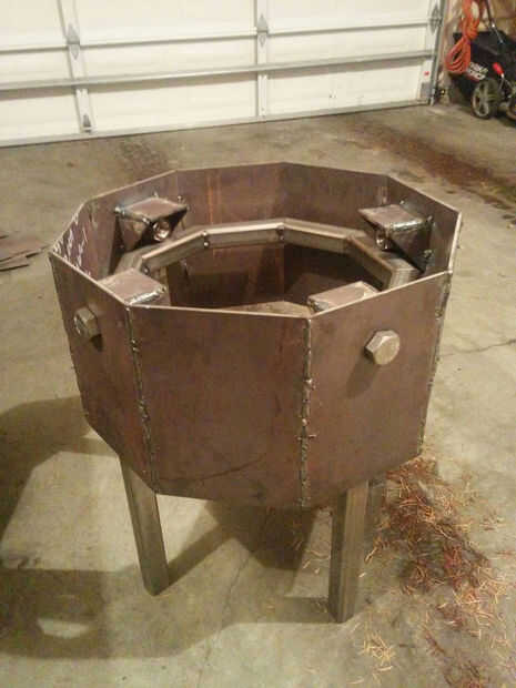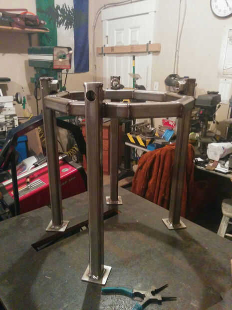 La primera prioridad fue hacer el marco de montaje, como debía ser fijado en concreto en el sitio tan pronto como sea posible. Soldando el primer anillo de tentáculo, y atornilladas las verticales del marco interno en su lugar con espaciadores de 1/32" antes de la soldadura en el anillo de bastidor. Esto garantiza un ajuste suave, como no tengo otra oportunidad para poner a prueba hasta el día de la instalación.