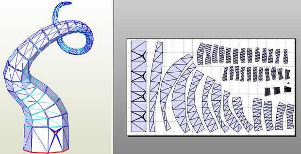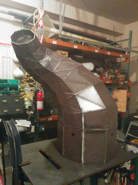 El diseño para el tentáculo sigue el mismo flujo de trabajo que he descrito aquí antes. He diseñado en una licuadora, Pepakura usado para desplegar las formas, entonces consiguió ésos por chorro de agua corte de acero. Esta vez estábamos usando 3/16" acero (AKA corten), que es una aleación que se oxida un poco y luego se para aherrumbrar. Se utiliza comúnmente para esculturas y detalles arquitectónicos.