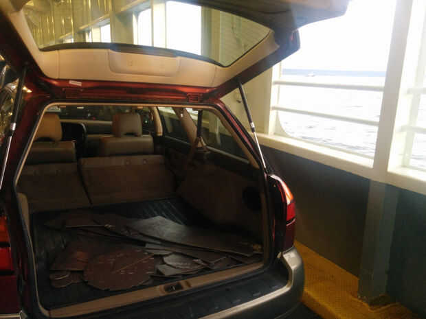 Todas las piezas juntas fueron alrededor de 300 libras, que era mucho más barato para mí tomar el ferry a la isla de Vashon y recoger de conseguirlos enviados. El material más grueso también significó que mi soldador antiguo no iba a cortar. No sólo no podía manejar 3/16" espesor stock, pero el alambre MIG para acero corten sólo viene en 0,045" en los carretes gigantes 33 libras. Así que aproveché esta oportunidad para actualizar el circuito 240 en mi tienda a 30 amperios y actualizar mi soldador a un Millermatic 212. Trabajando en proyectos de pagadas seguro que es conveniente a veces!