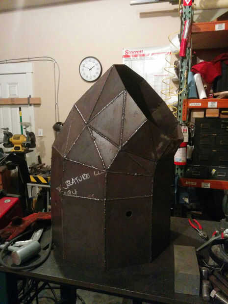 Debido al tamaño y grosor, no grabe las líneas de plegado en el acero, pero cortar completamente a través excepto las lengüetas en cada extremo. Esto funcionó bien, pero el acero era lo suficientemente grueso como para que las pestañas se rompieron a menudo cuando estaba doblando en forma. La aleación de acero corten podría haber hecho esta peor, ya que parecía mucho más rígido que el acero suave normal. A menudo terminé rompiendo pedazos separados totalmente, luego moler abajo de las pestañas por lo que pude soldar las piezas juntas limpiamente. Todavía quedaría con el enfoque de la ficha, sin embargo, lo sería una pesadilla mantener un seguimiento de qué pieza fue donde. Como él me tenía para grabar un código binario en los anillos más pequeños, mientras que miraban demasiado como para distinguir por la forma.