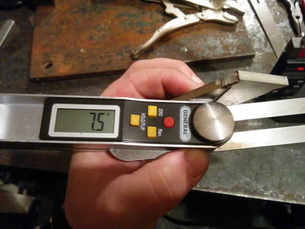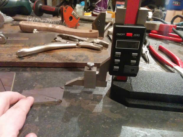 ¡ Funcionó! .. .kind de. El calibrador de ángulo era super cutre, tendiendo a cero vuelve a sí mismo al azar y se mantiene hasta los pedazos pequeños que estaba doblado eran muy torpe. Decidí hablar a algunas personas en el trabajo, a ver si tenían alguna idea mejor. Llego a trabajar en una metrología dimensional R & D lab, conozco algunas personas que son muy buenos en medirlas cosas. Uno de ellos hizo una observación muy simple: siempre es mejor medir distancias que ángulos, si nada puede evitarlo. ¡Claro!