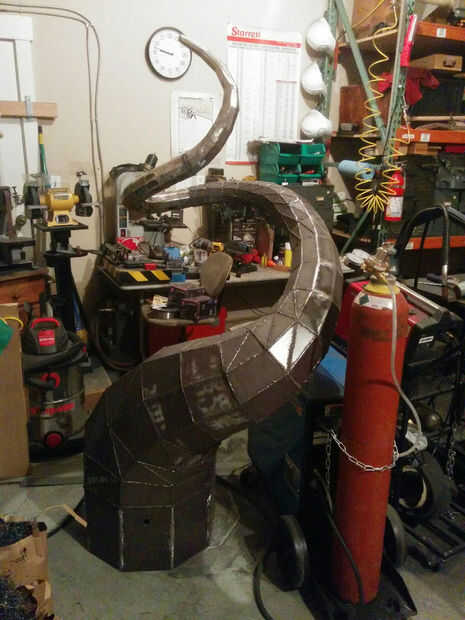 Empecé a tener problemas graves más adelante por el tentáculo. Aquí la geometría se complica, debido a la flexión y torsión del tentáculo. Antes, sólo 1 o 2 pedazos en cada aro tendría una puntuación de diagonal en ellos, pero ahora básicamente todos ellos lo hizo. Esto complica drásticamente la geometría, y las técnicas que había desarrollado más abajo dejaron de funcionar. Comencé a tomar horas para completar un anillo único, que protuberencias muchas veces para arreglar las diferencias. Como habían todavía otro 25 anillos para fabricar, fue realmente malo.