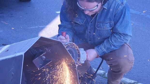Por suerte tengo unos amigos muy ingeniosos, que rápidamente fueron a alquilar una amoladora angular de 7" y un generador. (Tenga en cuenta a sí mismo, siempre arreglar para la energía en los sitios de la futura instalación!) Cortamos 3" de la parte inferior de los tentáculos, por lo que no fue demasiado largo. No podíamos bastante cortar completamente a través de las lengüetas del reborde, pero lejos que un cincel y martillo cómodamente tomó el cuidado de los demás. Y después algunos otros último minuto pulido para conseguirlo para encajar debidamente en el marco, en su lugar! Retiramos a un pub cercano para cerveza y comida tailandesa, victorioso.