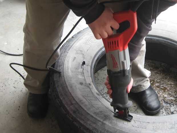 Para hacer esta inmersión asistida por el orificio de corte, descanso los pies de la sierra en el neumático con la hoja paralela a la pared de la llanta. Con la punta de la cuchilla sobre el agujero, me arranca el motor y mantenga la sierra firmemente mientras que suavemente inclinado lo hacia adelante hasta que la cuchilla cortar el agujero. A continuación, podrían inclinar el fondo.