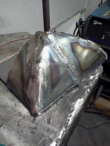 Después de tener un esqueleto básico comienzan a placa juntos. Utiliza la hoja de metal 16 calibre para medir la longitud entre dos soldar metal en la parte superior e inferior debe crear una forma triangular. marcar en la hoja con la piedra de jabón y cortarlo. superponer las piezas encima de las barras de metal de relleno y virar en lugar después de envolver totalmente la base soldadura las juntas juntas y moler al ras