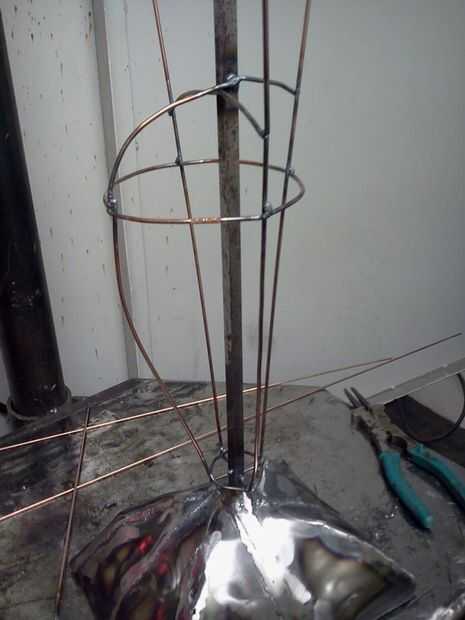 A continuación hacer otra estructura esquelética para el pájaro fuera del metal de relleno. para hacer este esqueleto de un anillo de metal de relleno más pequeñas sobre el diámetro de 1 1/4" y en la parte inferior de la más cercana a la base de la roca. luego realizar un anillo más grande 3/4 la manera encima de la varilla con un diámetro de aproximadamente 5" ejecutar cuatro o más barras de los dos anillos un lugar para conectarse attatch plumas.