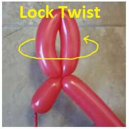 • Twist lock/Loop: Hacer un giro básico cerca del nudo y luego hacer otro giro básico cualquier longitud abajo el globo. El segmento medio de la curva en forma de bucle y ambos giros básicos dentro de las otras para completar el giro de la cerradura de la torcedura. Estos giros celebrará su forma lo que le permite seguir creando más giros.