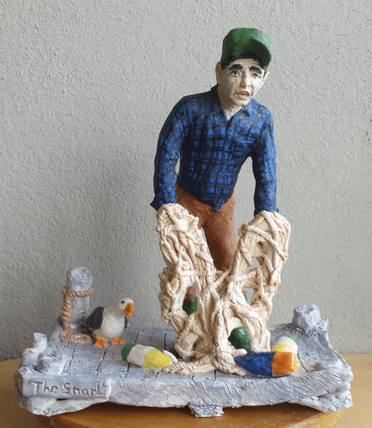 La escultura en este demo se llama "El alarido". Muestra a un pescador en un muelle, con una maraña de líneas de trampa de langosta (llamada localmente un gruñido) con una expresión no muy feliz en su rostro. Boyas y una gaviota de "arte popular" completan la escena.
