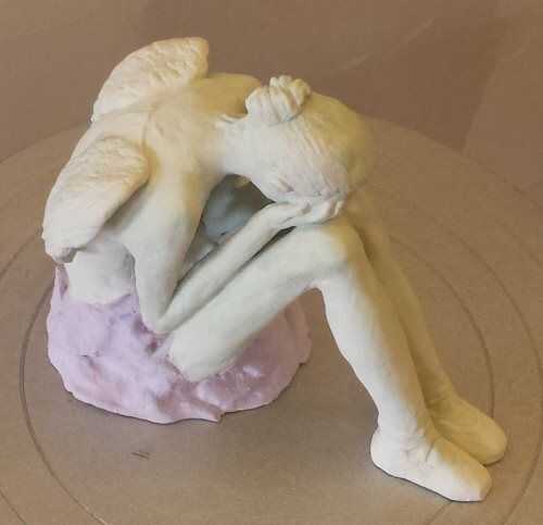 La figura entera excepto por su piel y su pelo estaba cubierto con un bajo comercial vidriado de Duncan llama realmente blanco. Para el tutu diluir el esmalte con agua para que la textura no se oculta y sólo para dar este material un poco diferente.