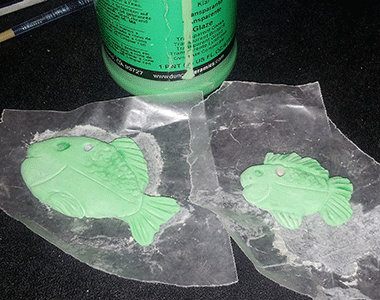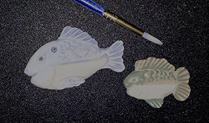 Pintar con el color de debajo-esmalta. La arcilla seca es muy absorbente. Si usted encuentra que su esmalte es difícil de aplicar, fino una pequeña cantidad de agua por lo que impregna en la arcilla. Puede hacer debajo de capas de un color y cubrir con otro color como lo hice con bacalao marrón y verde. Puede Agregar puntos mediante el uso de un cepillo de dientes salpique de color fino. Probar con diferentes enfoques. Estas pequeñas esculturas son una buena manera de aprender acerca de acabado afecta.