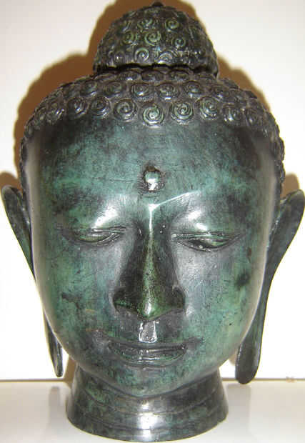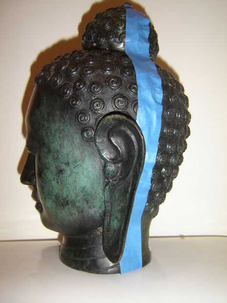 Compré esta cabeza tiempo atrás en un mercado de pulgas y quería crear una versión más grande. He decidido crear el frente de la mitad de la cabeza para evitar todos los socavados y que un molde de una sola pieza. Coloca cinta en la cabeza para indicar mi línea de corte y me tomaron fotos.