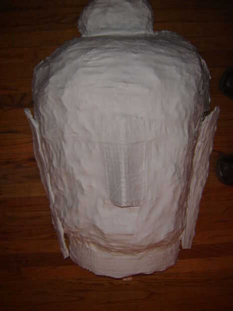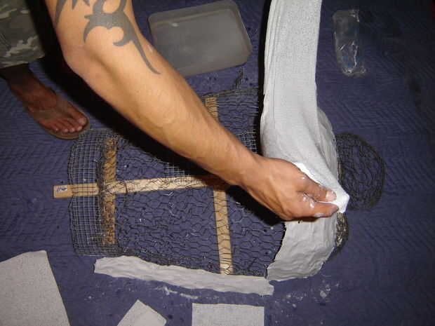 Humedecer el paño del yeso con agua y aplicar dos capas en direcciones opuestas sobre el alambre de pollo.  Deje que se seque durante la noche.  Una vez seco debe tener una superficie sólida para iniciar construcción de papercrete.