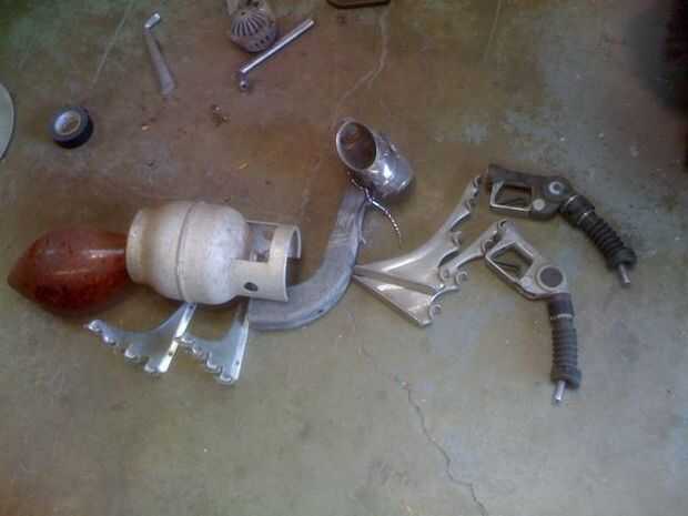Generalmente cada una de mis piezas comenzar arreglando varias piezas encontradas en el piso como un rompecabezas hasta que empiezo a ver una forma que me gusta. En este caso ya había recogido un número de objetos que se esperaba se suman a una Mantis. Los principales elementos fueron: un par de bombas de gas a realizarse en pinzas, un sistema de cuatro soportes de varilla a utilizar como elementos de la pierna, un tanque de propano para el cuerpo, una lámpara de suspensión para el abdomen de la cortina y vio el brazo de un rollo para formar la parte superior del cuerpo.