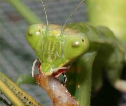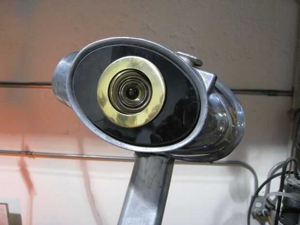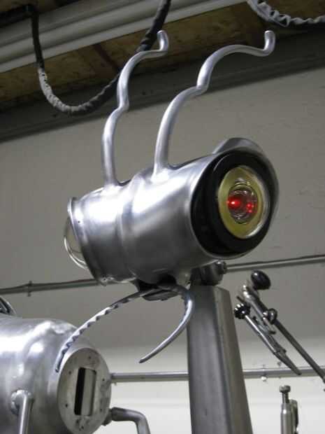 En la fase de investigación de este proyecto vieron muchas fotos de Mantis religiosa. Tienen cabezas muy pequeñas en relación con sus cuerpos, y casi la totalidad de esta pequeña área es tomado por los ojos. Quería que mi escultura para mantener una semejanza a la criatura real pero todavía transmiten un montón de carácter. Esto significaría el truco Sci-Fi inspirado de malos ojos rojos que brillan intensamente. He seleccionado algunos orificios de latón gran angular peep de puertas de piso. Con un solo LED pequeño colocado detrás de la lente que conseguí el efecto que quería. Luego se montaron través de plástico negro en la parte de accesorio bolso de viejos aspiradores Kirby.