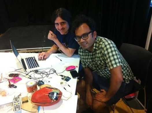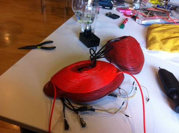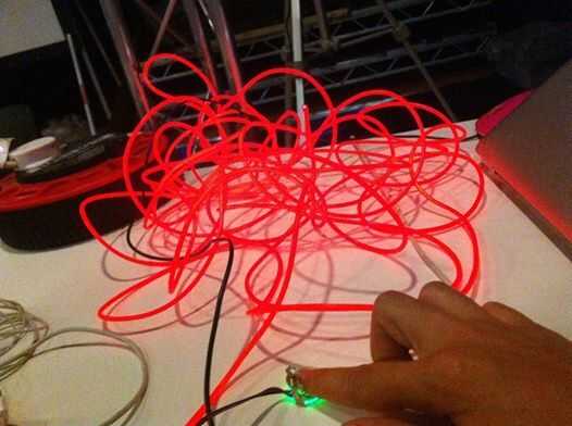 La pieza está utilizando un sensor de pulso a pulso de 30 metros de luces EL alambre. Cada 15 metros está conectado a un pin del Arduino y pulso el corazón L con 2 pulsos.