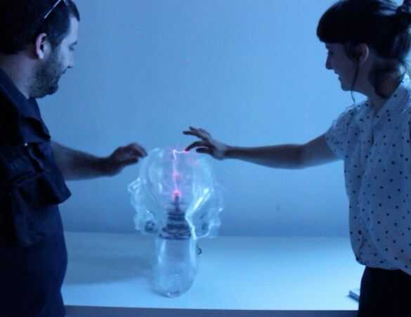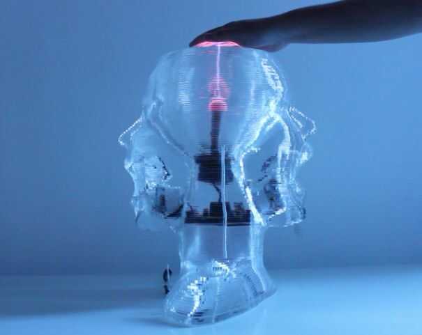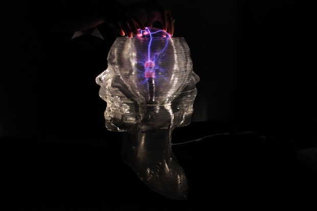 La escultura está realizada con láser de capas de acrílico transparente y un cerebro de plasma neuróticos interactivo que habla cuando se toca.