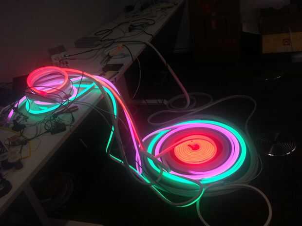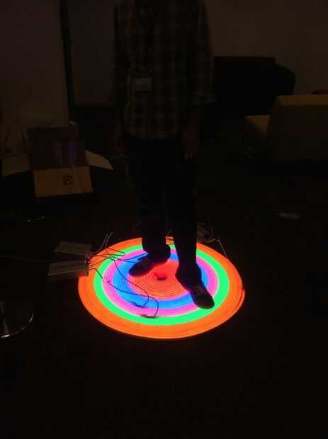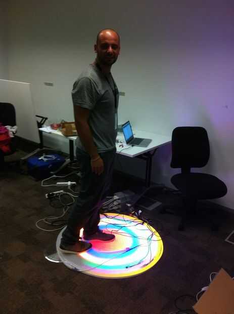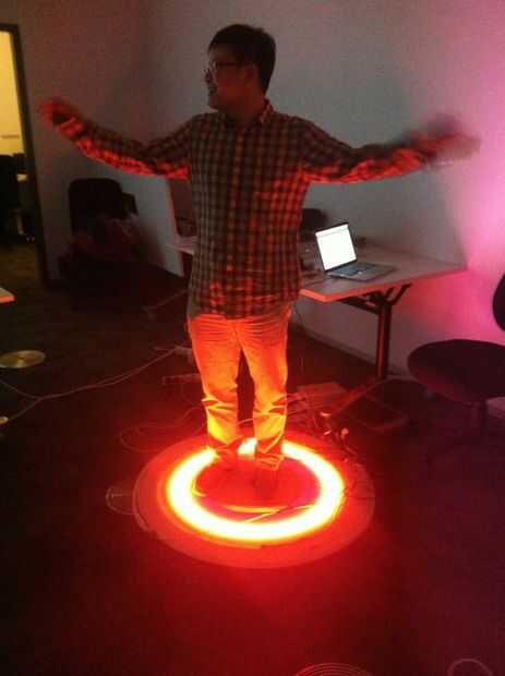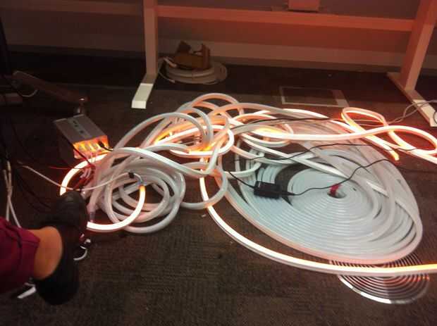 El interactivo de la pieza fue hecho usando Arduino, un sensor de presencia máximo Botix (1 x Distanciómetro ultrasónico – Maxbotix LV-EZ0) y NEON LED flexibles
