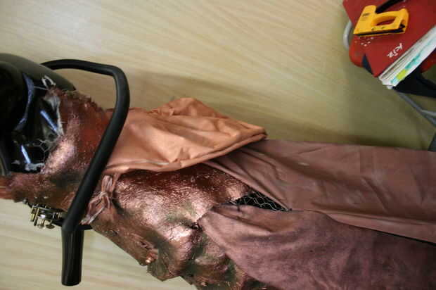 La segunda etapa fue coser hojas pequeñas de fibra de vidrio. Yo pude han utilizado hojas de mayor tamaño pero creo que las más pequeñas hojas superpuestas le dio un efecto mosaico cool, que también dejó algunas costuras visibles, la textura. Para la base del vestido he utilizado áspero (reparación de automóviles!) láminas de fibra de vidrio y una más fina textura uno para las zonas delicadas como la blusa. Después de coser todo al marco chickenwire cubrió la fibra de vidrio con resina de fibra de vidrio que increíblemente dura! Lo hice en varias etapas pequeñas, prefiriendo se superponen láminas de fibra de vidrio que pánico y hacerlo todos a la vez. (Después se mezcla la resina, establece rápidamente) * la resina realmente se ve muy bueno si aplicarán un montón y dejaron gotea o pulsa los objetos en él como dries.*