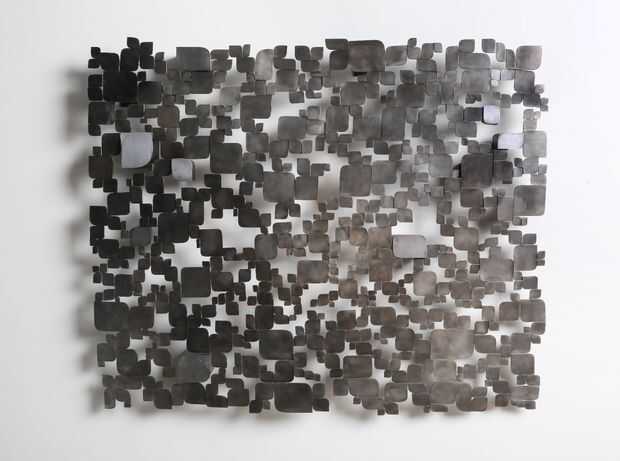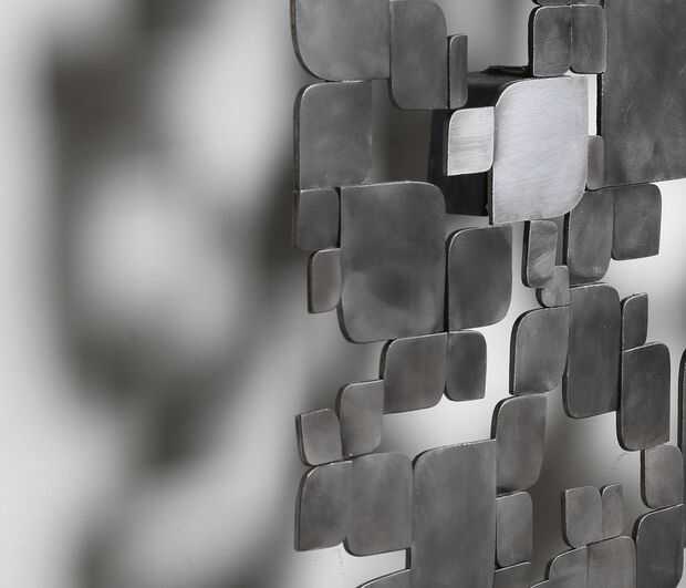 Se trata de un gabinete de pared que hice soldando cientos de piezas de acero forma. Es 50 "x 60" x 3.5 "y cuelga de tacos que soldó con autógena en la posición en la parte posterior. Oculta dentro de las piezas, hay nueve cámaras cubiertas por tapas magnéticas. Se puede ver al lado de uno de ellos en la primera imagen. Esta pieza es el producto de una enorme cantidad de experimentación, aunque en verdad es bastante fácil de hacer. Voy a renunciar a explicar el aspecto armario de la pieza y el enfoque totalmente sobre la textura de la superficie.