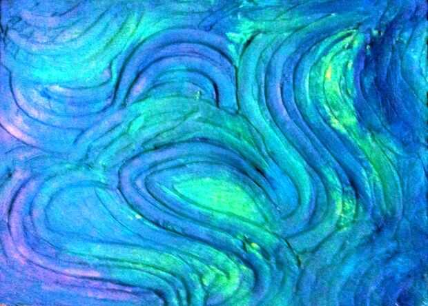 En la primera muestra les dijo que una pizca de amarillo de la pintura al azar y luego les dio un azul oscuro para pintar... una preciosa turquesa fue descubierta! Pida a los alumnos lo que esta textura se verá bien en... tenemos sugerencias de mar, las nubes y así sucesivamente